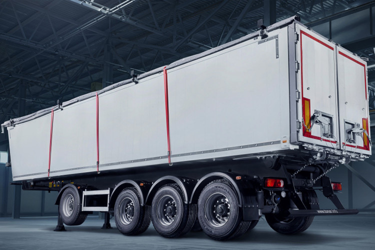 - Джамбо. Це напівпричіп, місткістю 96 м3 з ламаною рамою та Г-подібною підлогою. Діаметр задніх коліс – зменшений. З огляду на це внутрішня висота становить 2,45 і 3 м за рівної ширини 2,45 м. Загальна довжина – 13,6 м (4,2 і 9,4 м кожен із відсіків. Може перевозити за один раз 20-24 тонни.