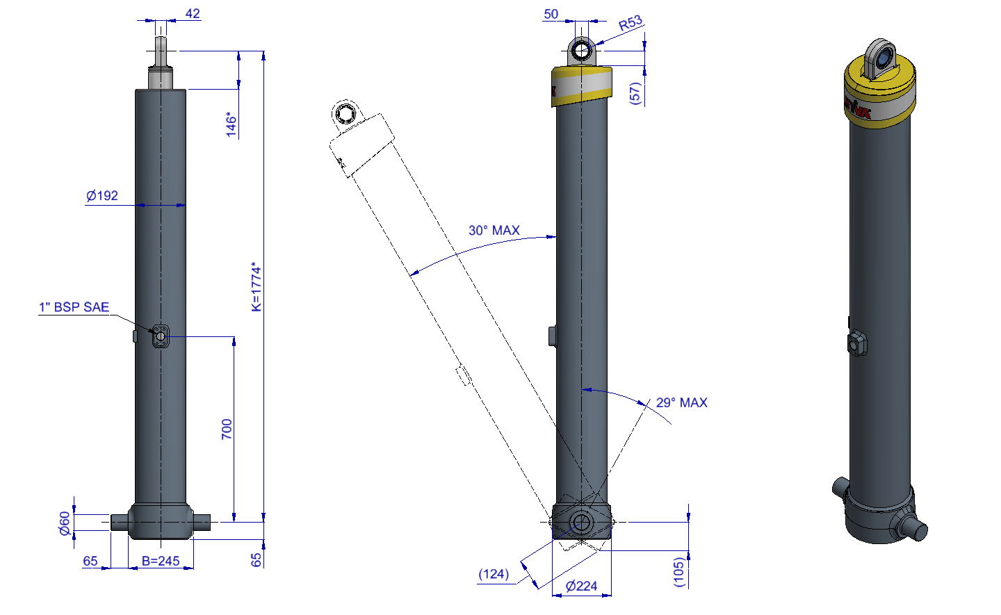 Цей циліндр є лише підйомним пристроєм і не може використовуватися як елемент конструкції або піддаватися бічному навантаженню. Бічні навантаження та/або погане вирівнювання можуть призвести до протікання балона. Тому Hyva рекомендує використовувати підставку, навіть у тих випадках, коли циліндр нахиляється тільки назад або вбік. Циліндр пофарбований у чорний колір RAL9005. Відповідні гідравлічні оливи див. у специфікації OIL-0011. Детальнішу інформацію про доступні кронштейни та люльки див. у специфікації 015BRA07. Детальні розрахунки можна зробити за допомогою програми HYVA Tipper. Зусилля циліндра на першому ступені (за даними програми HYVA Tipper) не повинно перевищувати максимально допустиме (див. специфікації вище).
