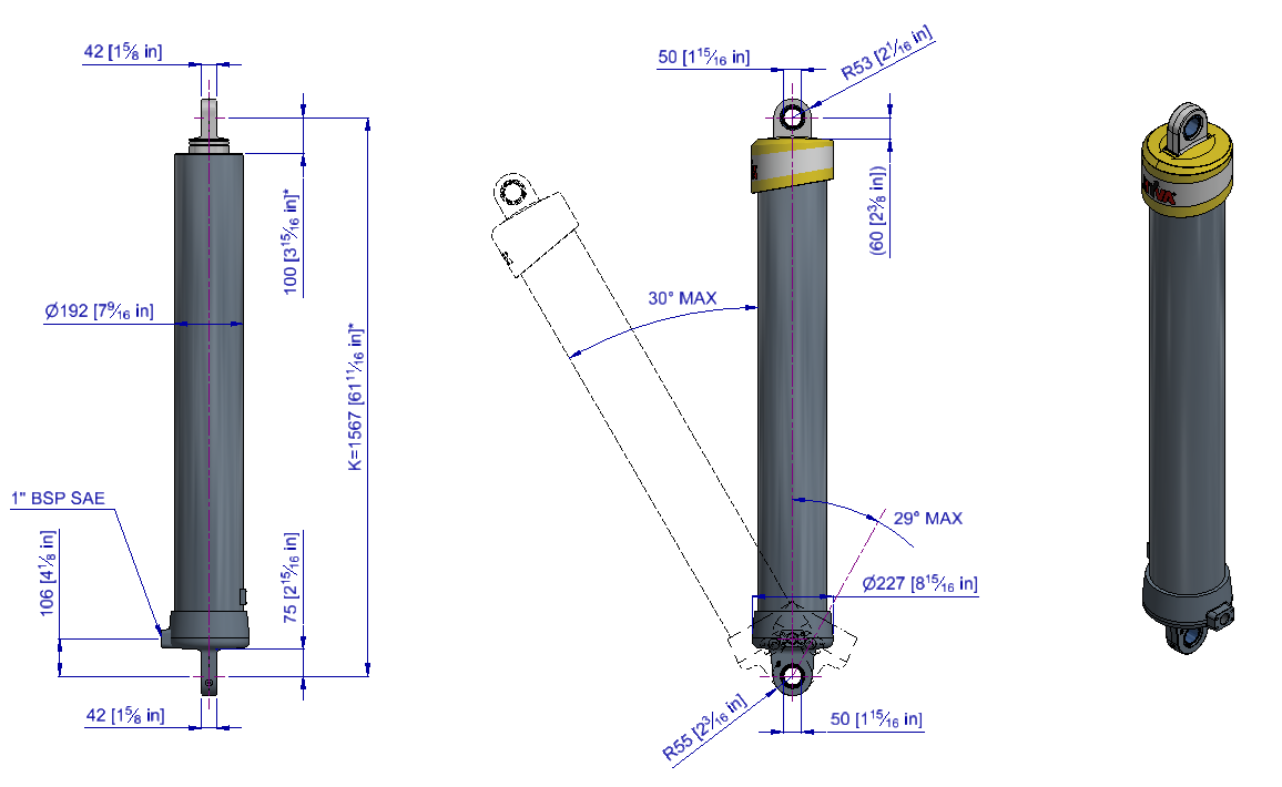 Цей циліндр є лише підйомним пристроєм. Його не слід використовувати як конструктивний елемент і не слід піддавати бічним навантаженням. Опрокидувальний клапан повинен мати скидання тиску на отворі циліндра, встановленому не вище максимального робочого тиску. Переконайтеся в максимальному навантаженні на циліндр. Робочий діапазон температур складає від -40°C до +80°C. Максимальна тривалість висування становить 0,5 години (за винятком закалених сходинок з твердим хромуванням). Циліндр фарбований в чорний колір (RAL9005) з мінімальною товщиною покриття, відповідною 480-годинному випробуванню в нейтральному сольовому тумані згідно з ISO 9227. ¹ Клапан скидання Hyva.